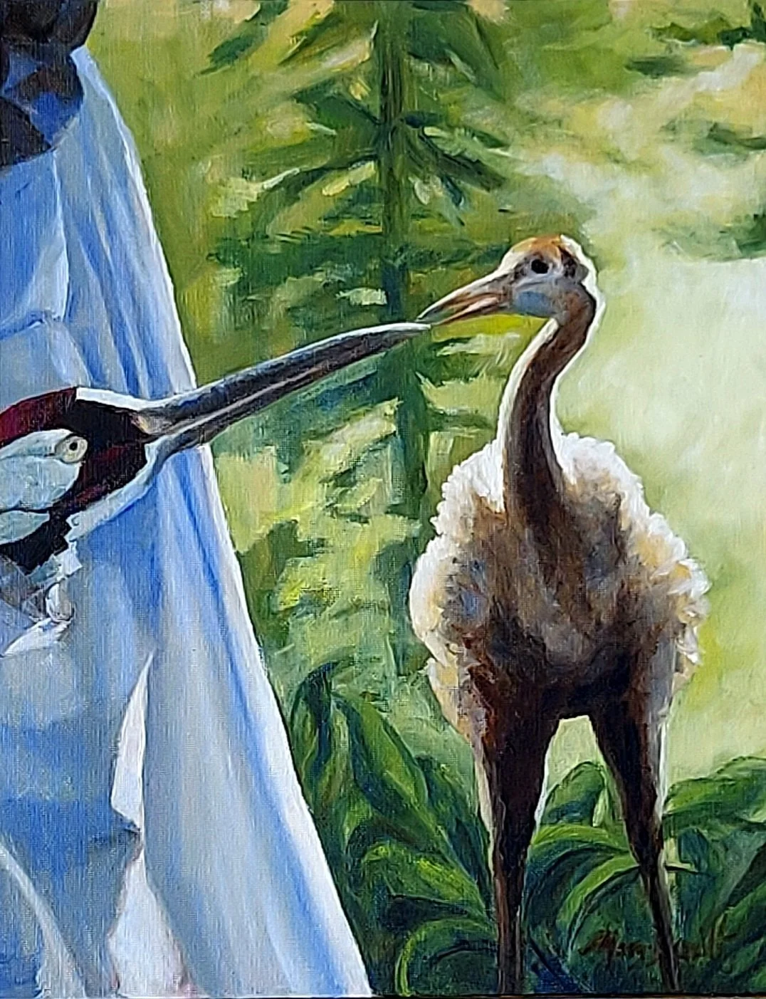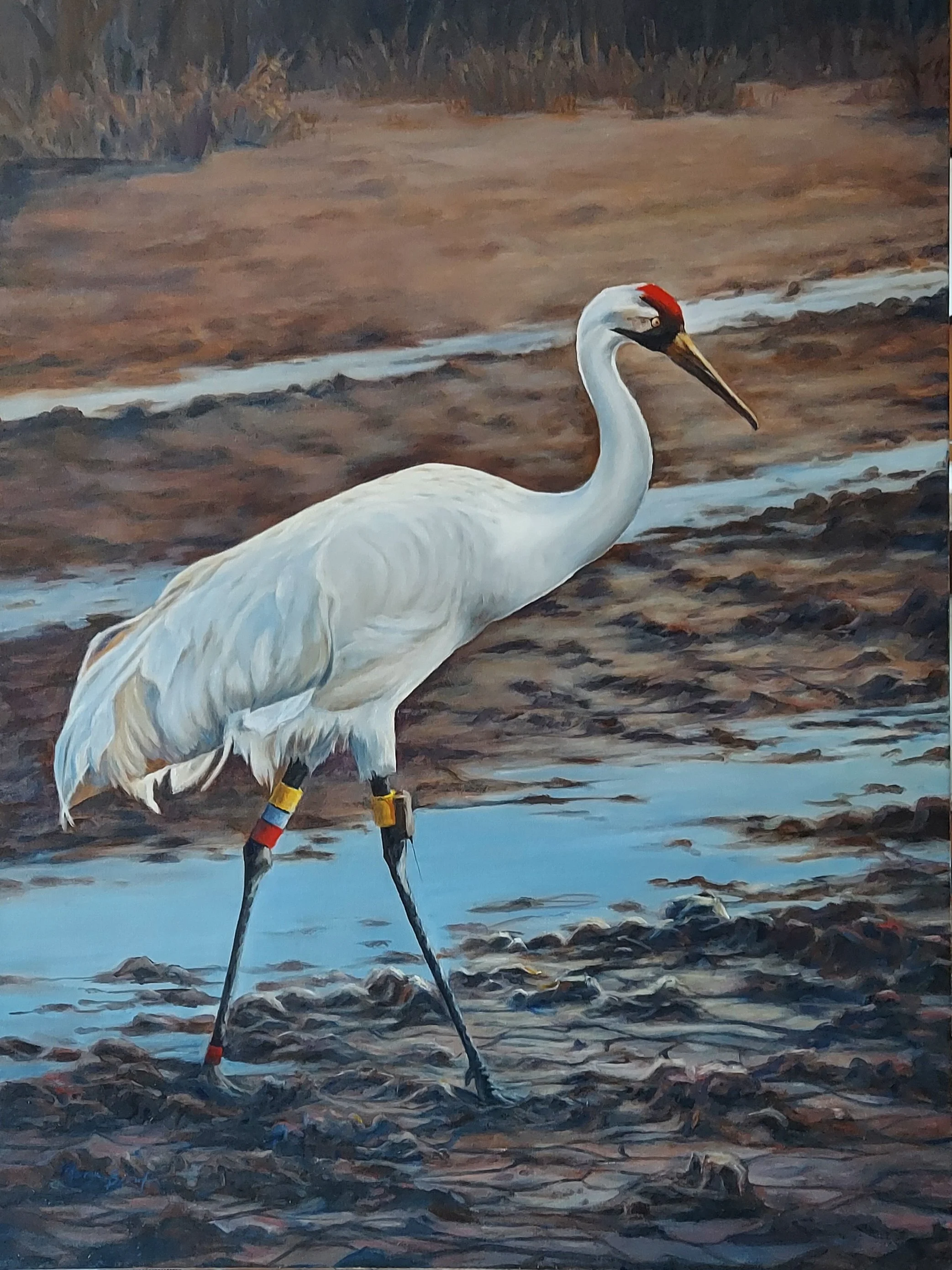Since 2011, the Whooping Crane Reintroduction Project has increased the number of wild Cranes in Louisiana from 0 to about 86 individuals. In this painting, a juvenile, which still has its cinnamon-colored plumage, is being carried to a temporary holding pen until it is released into the wilds of Southwest Louisiana.